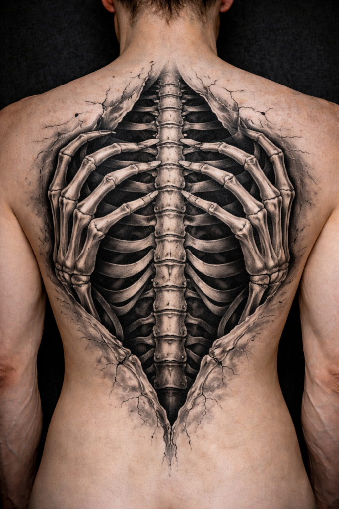 • Baroque Lace: Ornamental lace spreading like a shawl across the upper back. Roses, skulls, or cryptic initials hidden in the fabric.